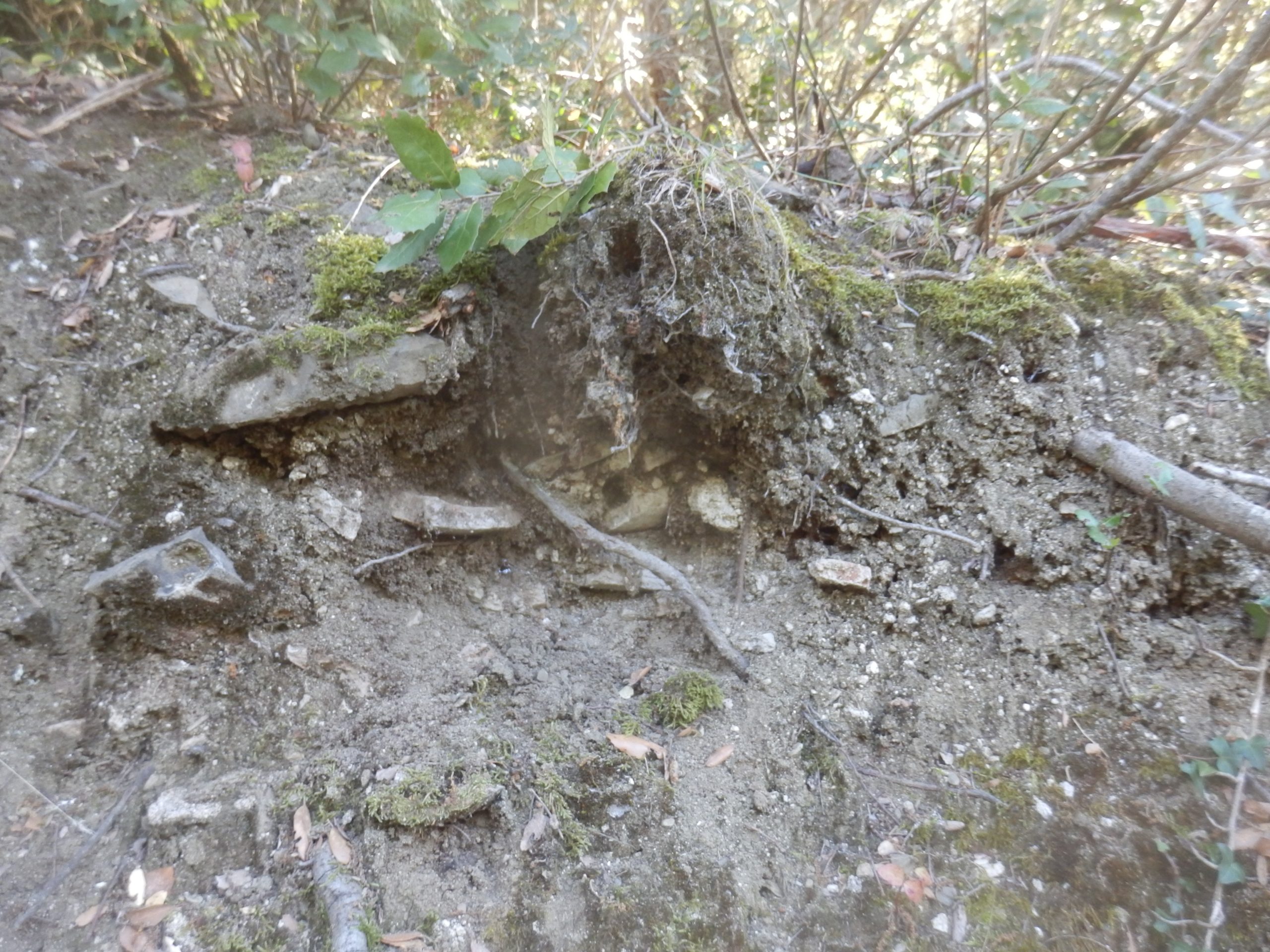 Eglise de Sant Couat ← Précédent Suivant → Décapage accidentel lors de la création d’un layon, révélant sur le talus un horizon de tessons et mortier de chaux sur 7 m / + L.